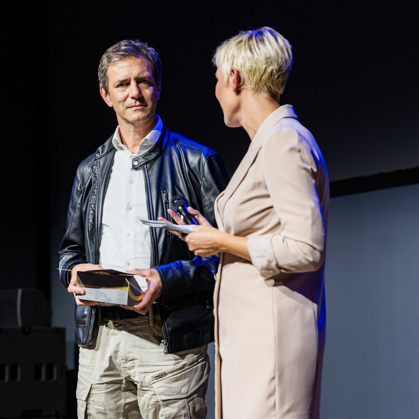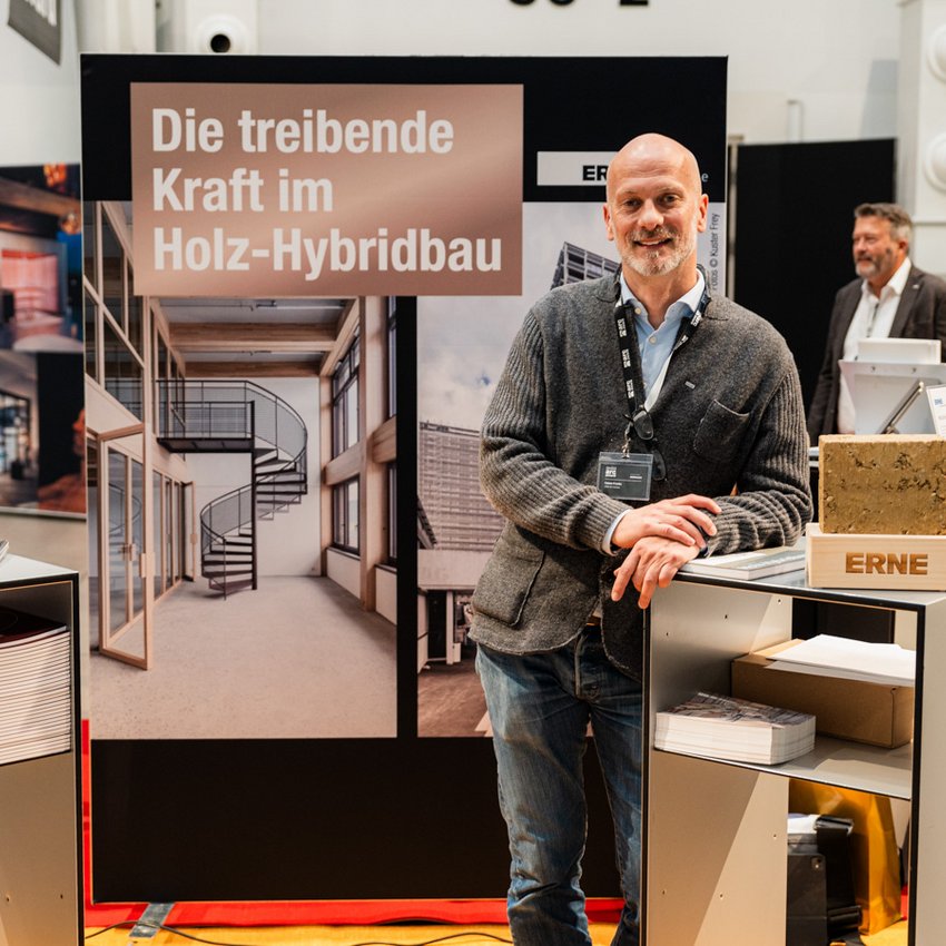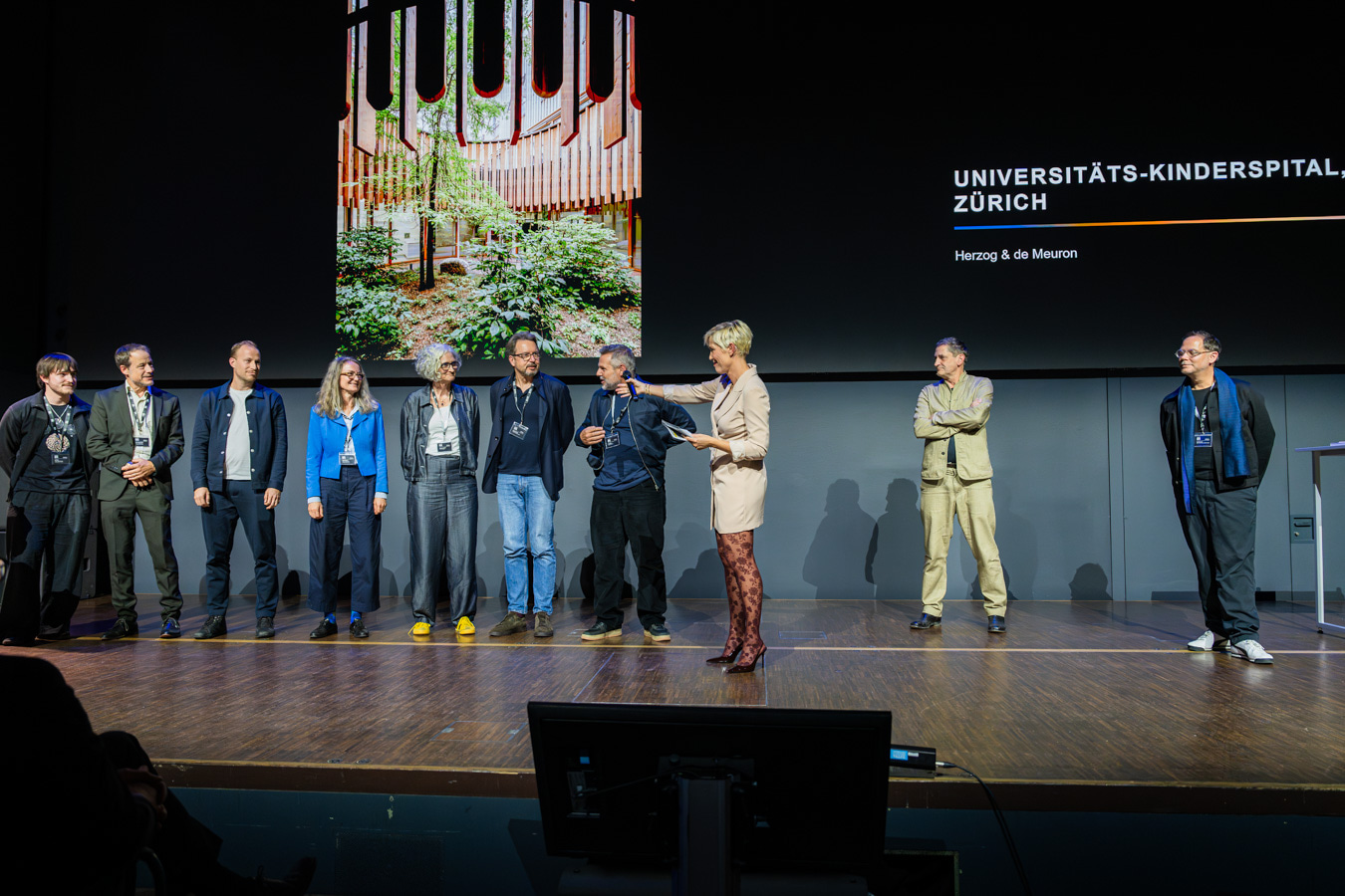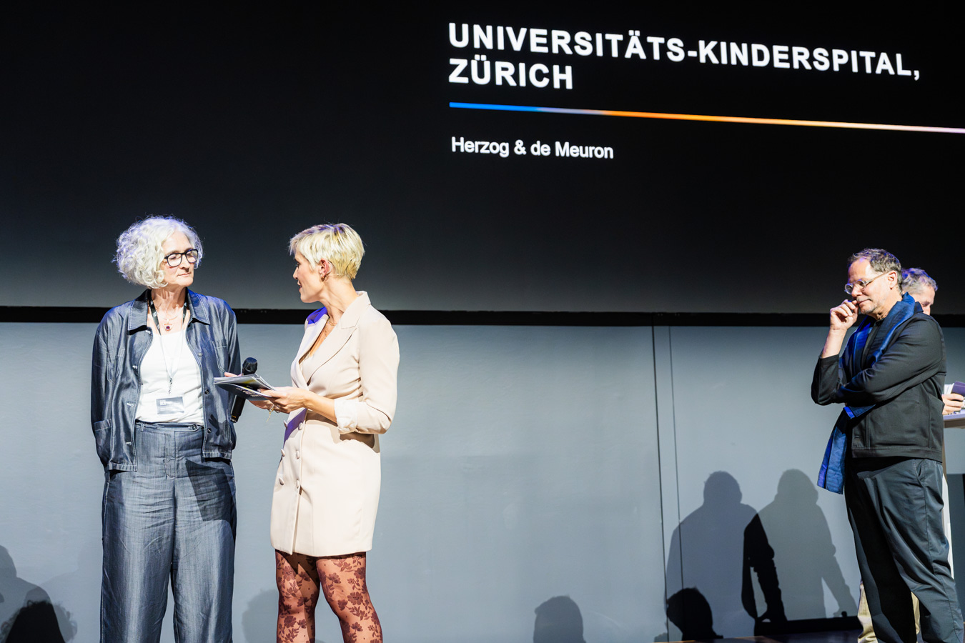 Patrick Suter, Geschäftsführer von ERNE AG Holzbau, überreichte Herzog & de Meuron im Namen der ERNE Gruppe den Preis für das Siegerprojekt in der Kategorie «Bildung und Gesundheit».