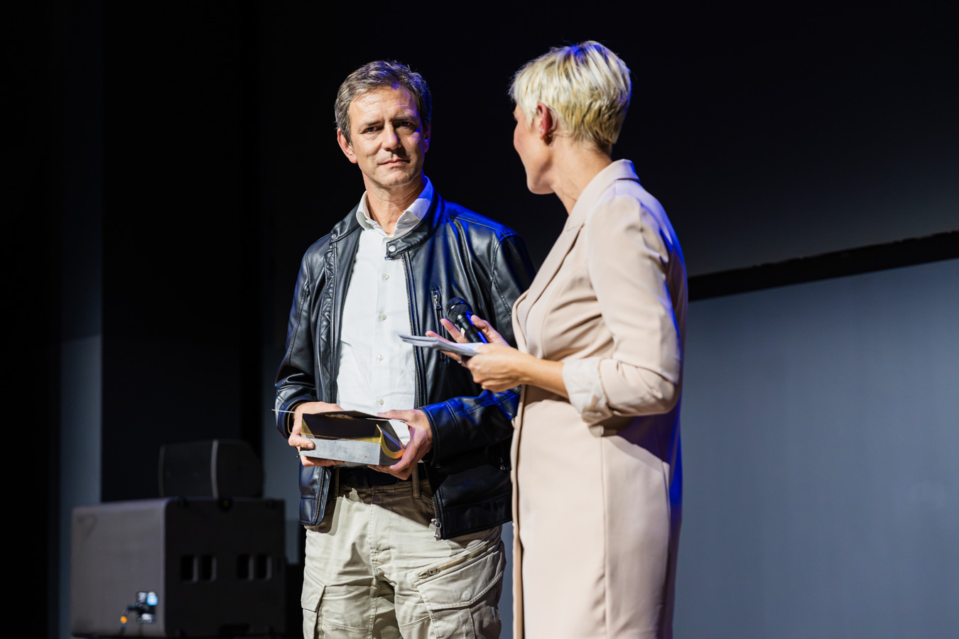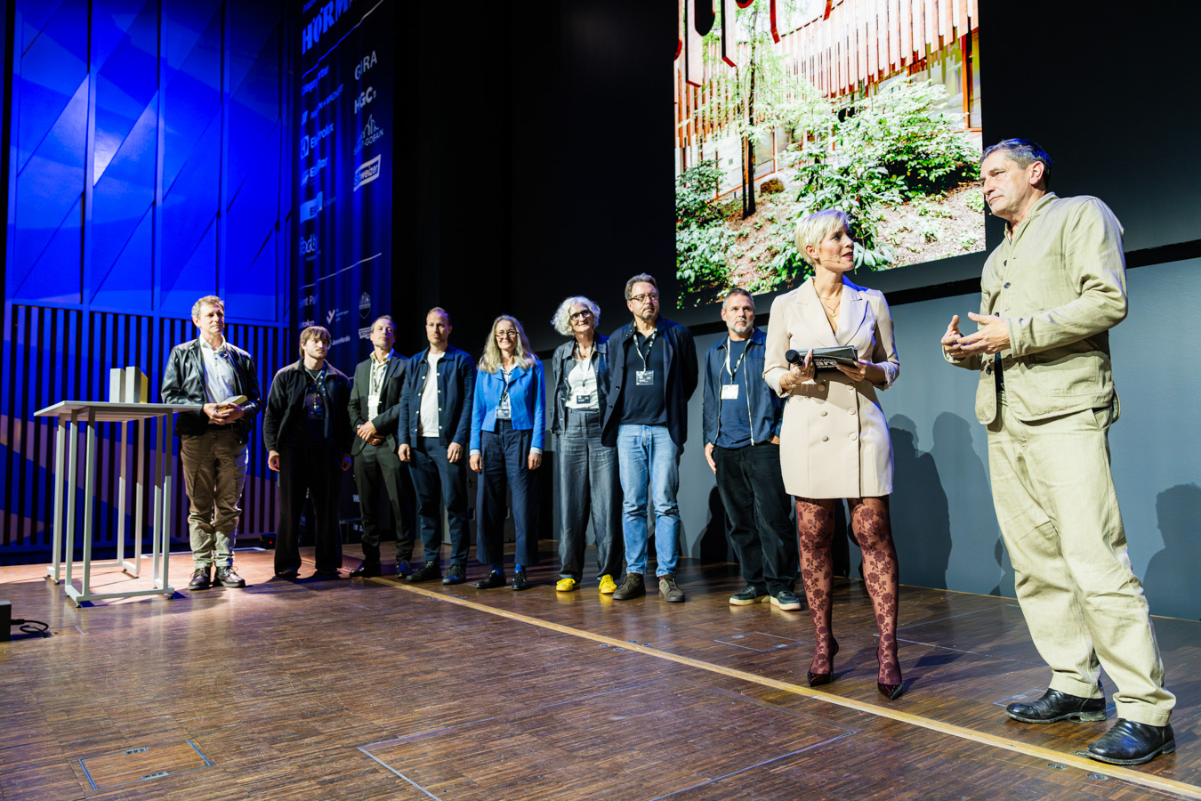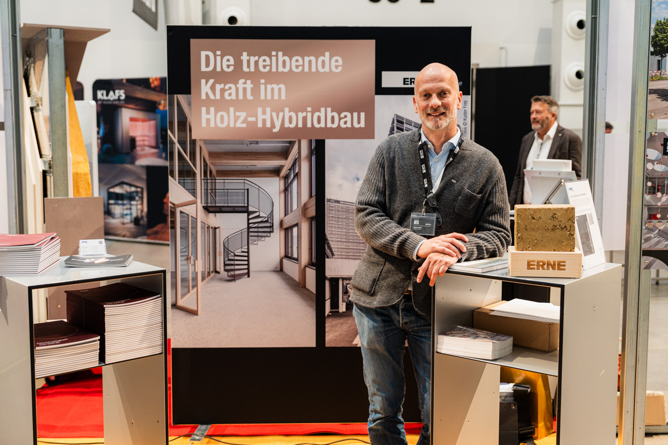 Patrick Suter, Geschäftsführer von ERNE AG Holzbau, überreichte Herzog & de Meuron im Namen der ERNE Gruppe den Preis für das Siegerprojekt in der Kategorie «Bildung und Gesundheit».