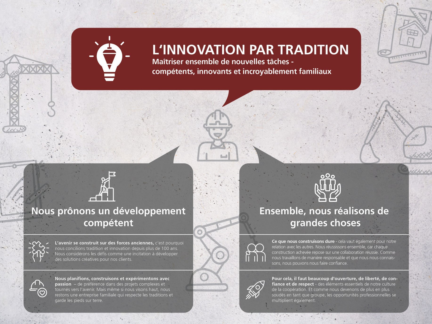 Au sein du groupe ERNE, les collaborateurs sont au centre des préoccupations. En tant que groupement de onze entreprises du secteur de la construction, nous t'offrons non seulement des projets passionnants, mais aussi et surtout un environnement de travail dans lequel tu peux te développer, t'investir et te sentir bien à long terme.