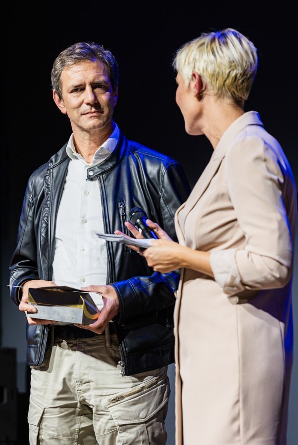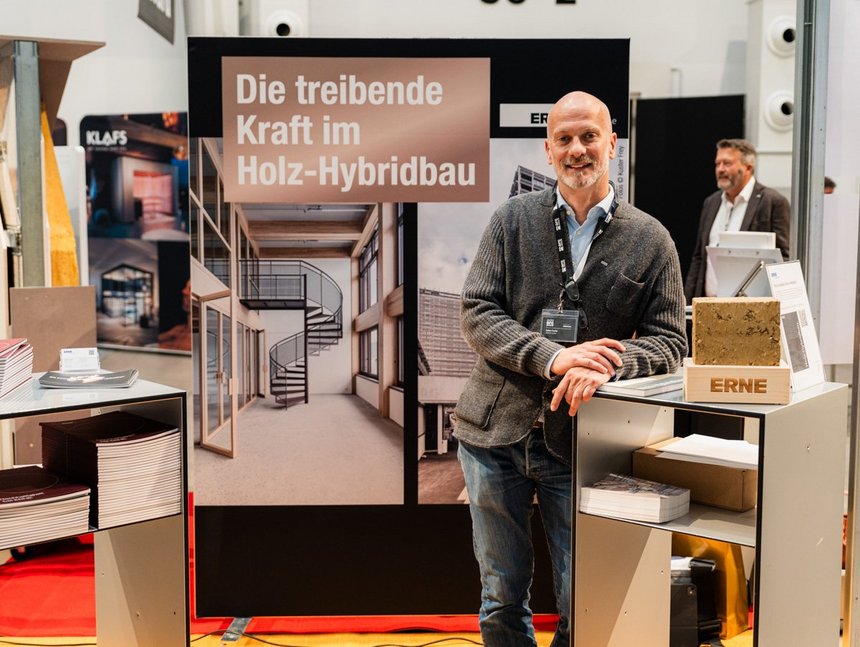 Patrick Suter, directeur d'ERNE AG Holzbau, a remis à Herzog & de Meuron, au nom du groupe ERNE, le prix pour le projet gagnant dans la catégorie "éducation et santé".
